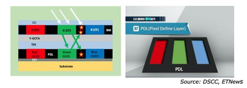 根据 Omdia 的分析师 David Hsieh 猜测,三星很有可能采用的是 COE 技术(Color OnEncapsulation ),在 OLED 上镀一层彩膜来吸收反光,从而取代偏光片。