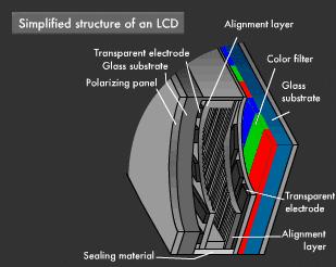 而 LCD 屏幕的成像原理,就是在两块偏振片中间加入一层液晶分子,用电场控制液晶分子的扭动来让光线「逃出」偏振片的遮挡,点亮屏幕显示出影像,这时候再加上彩色滤光片,便可以得到彩色的影像。
