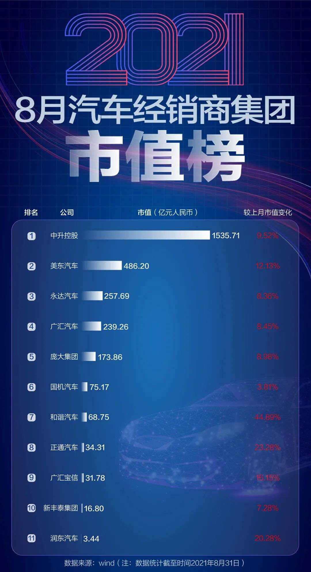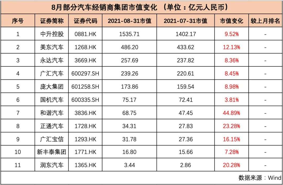 8月,国内11家汽车经销商集团全部“飘红”,市值合计较上月增加275.64亿元。