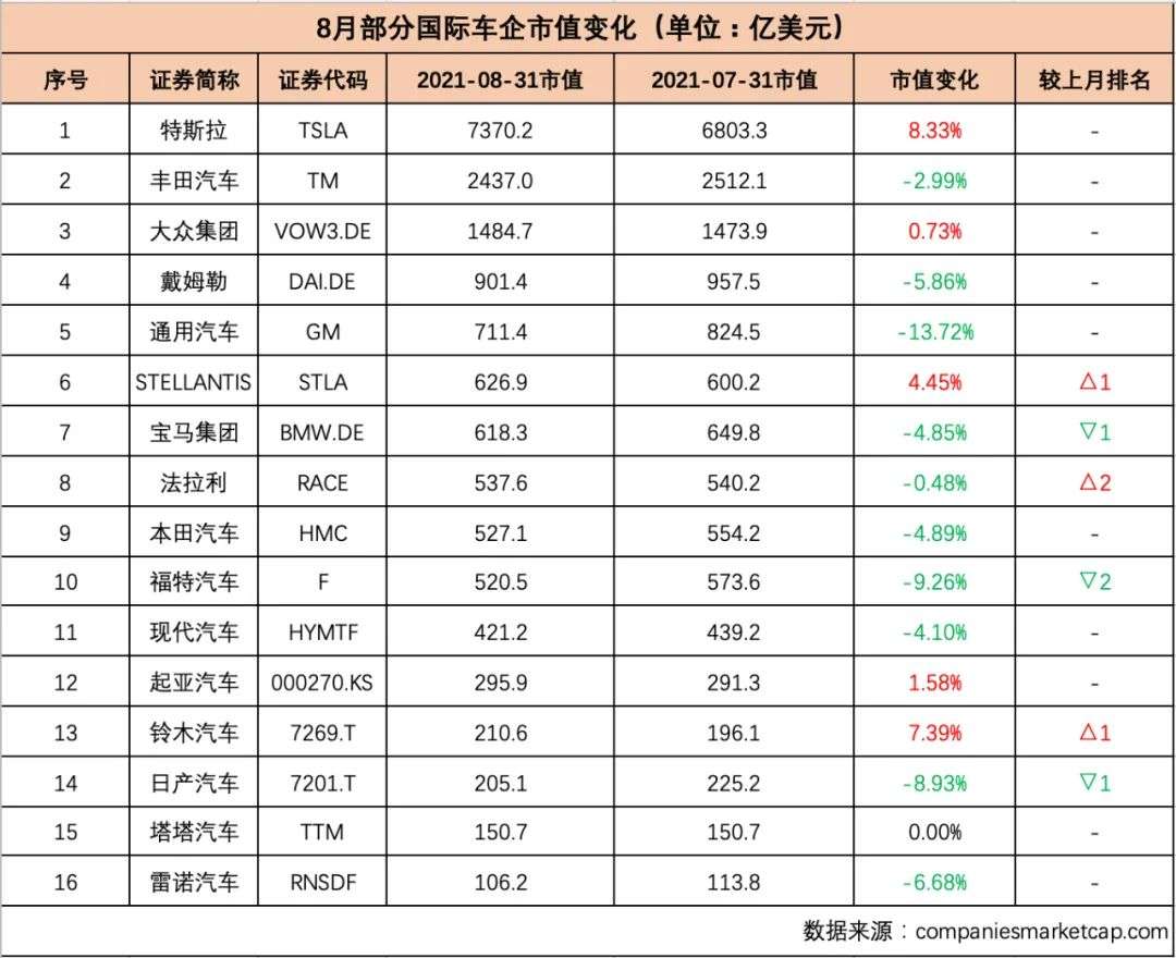 16家企业市值合计增加得益于特斯拉(TSLA)、STELLANTIS(STLA)、铃木汽车(7269.T)市值的增加。其中,特斯拉8月市值增幅最大,环比增长了8.33%,市值增加了约567亿美元,至7370.2亿美元,继续稳坐冠军宝座。