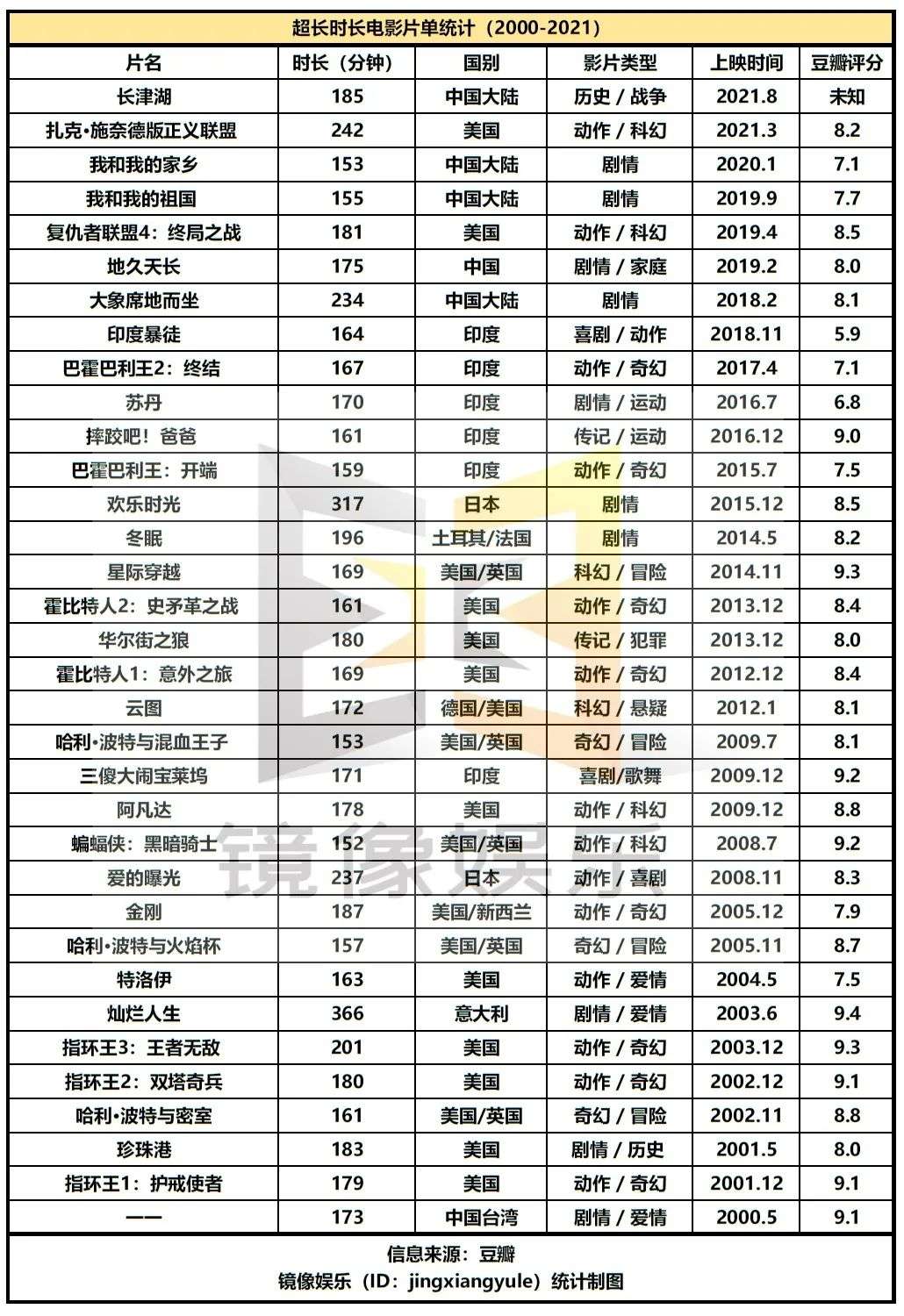 前有巨额投资等待市场反馈,后有博纳影业寻求IPO之路,《长津湖》为什么选择了风险更大的超长时长?在等待《长津湖》的日子里,镜像娱乐将盘点那些年时长180分钟+的电影。
