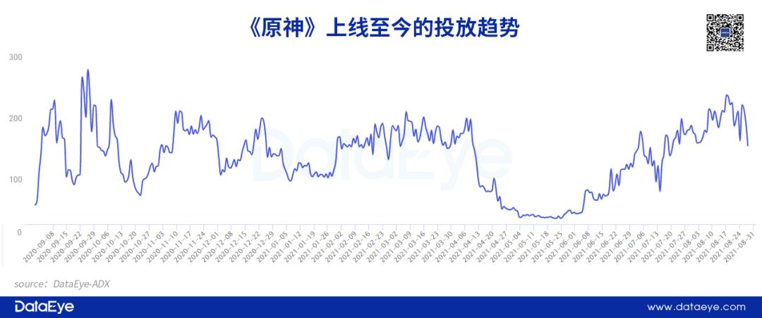 通过DataEye-ADX平台数据,我们可以清晰地看到《原神》上线至今在买量上投入较小,投放峰值也不过日投283组素材,与头部买量产品动辄日均3-4000组的规模相比,买量投入微乎其微。
