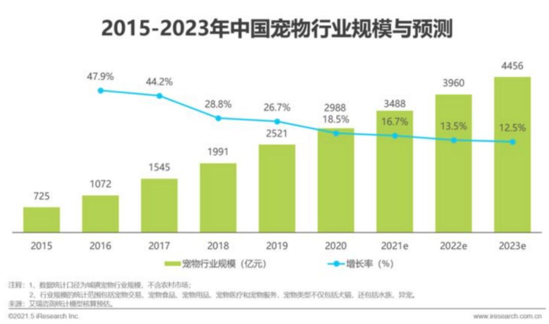 根据艾瑞此前发布的《2021年中国宠物消费趋势白皮书 》显示,2020年我国宠物行业市场规模接近3000亿元。受政策、经济、社会和技术因素驱动,以及疫情带来的更多潜在养宠人群及情感消费,未来三年行业将继续保持平稳增长,复合增速预计14.2%,到2023年规模将达到4456亿元。