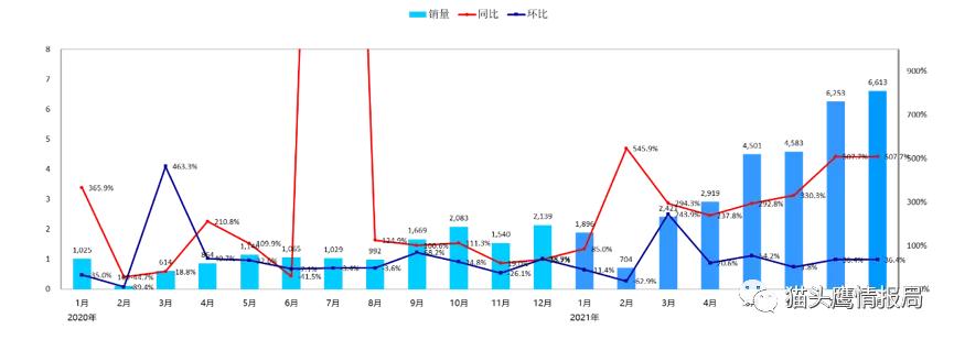 (配图:哪吒汽车2020-2021年汽车月销量和增长情况)