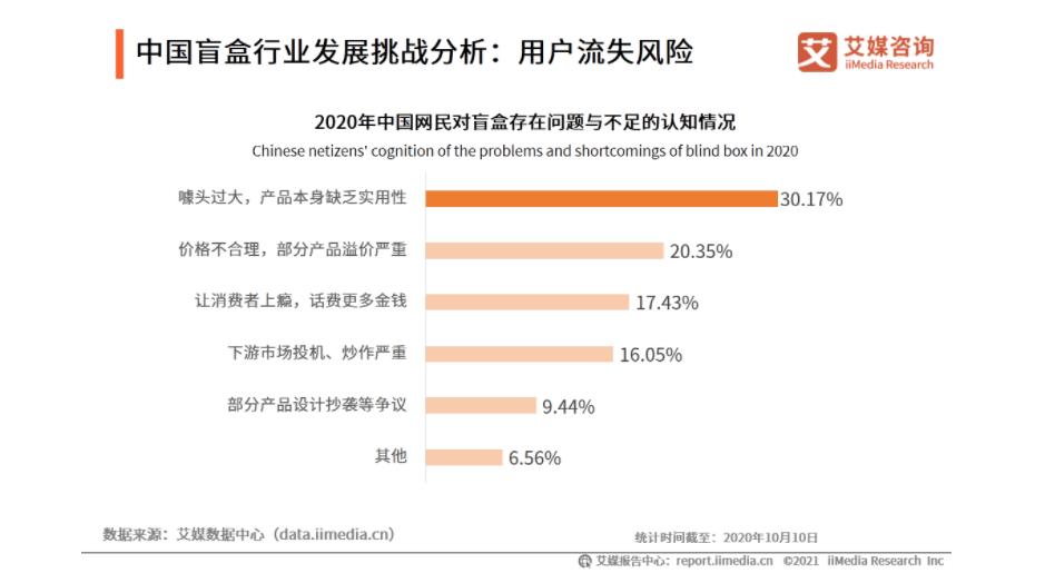 盲盒经济在不断发展的同时,盲盒噱头过大和价格不合理,成为了消费者主要反馈的问题,所占比例超过50%,其次是容易上瘾、下游市场投机和产品设计抄袭,这些问题的存在容易导致用户的不断流失。盲盒经济要持续健康的发展,需要一套完整的市场法规,明确商家的义务和责任。