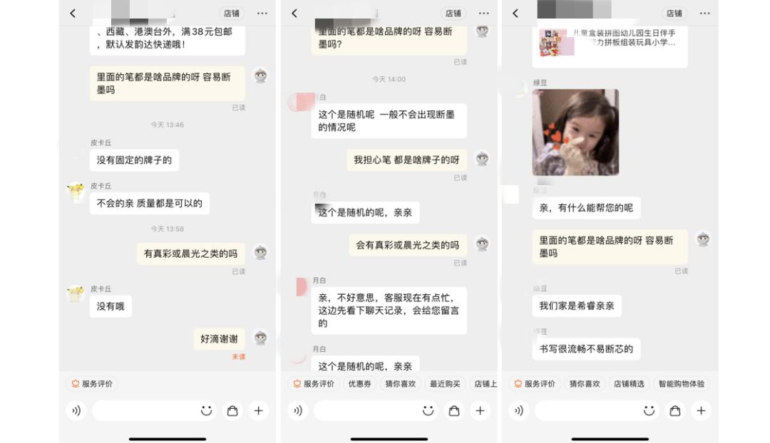 不只是线下文具店,网购平台上的文具盲盒同样存在类似的问题。笔者询问了三家卖文具盲盒的网店后发现,在问到“盲盒里的笔是什么品牌”、“会有真彩或晨光之类的品牌吗?”等问题时,一家商家表示明确没有,另一家一再强调“随机”发货,并未直接回答问题,而第三个卖家表示盲盒里的笔来自一个名为“希睿”的品牌。
