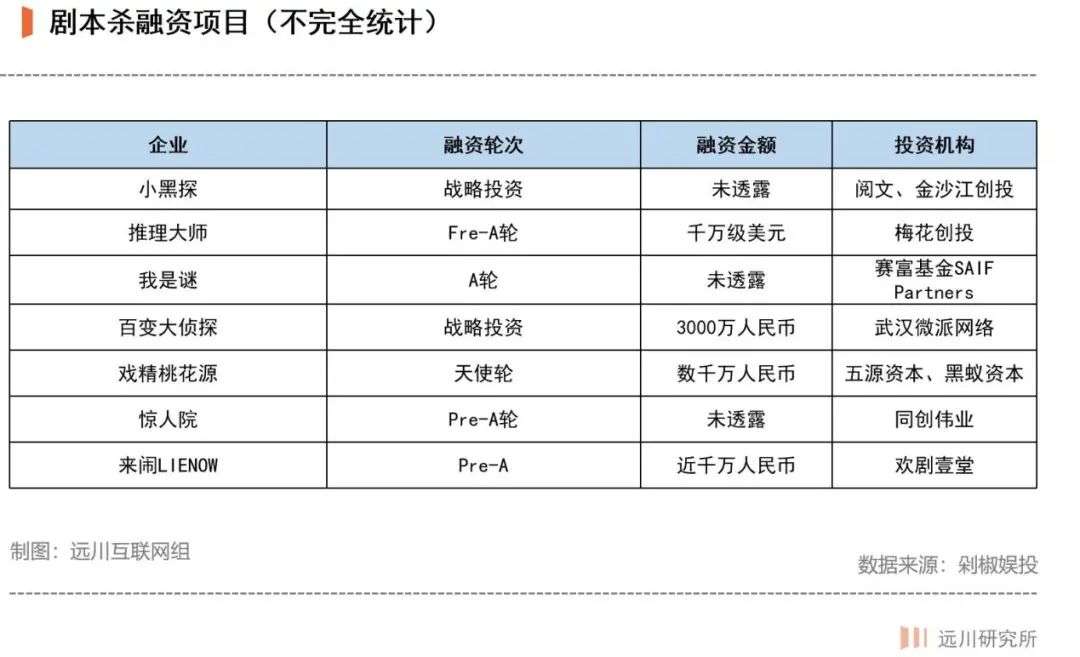 投资机构同样蠢蠢欲动。阅文和金沙江创投抢先投资了立志成为中国面游界appstore的小黑探,它囊括了剧本杀发行、作者培训、IP改编等业务,可以理解为一个剧本杀的电商平台。除此之外,沉浸式游乐项目“戏精桃花源”、“我是谜”等相关剧本杀创业公司都在陆续获得融资。