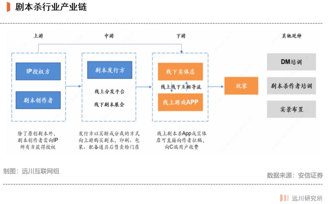目前,剧本杀行业形成了“IP授权方/剧本创作者—剧本发行方—线上游戏APP/线下实体店—玩家”为主的完整产业链。