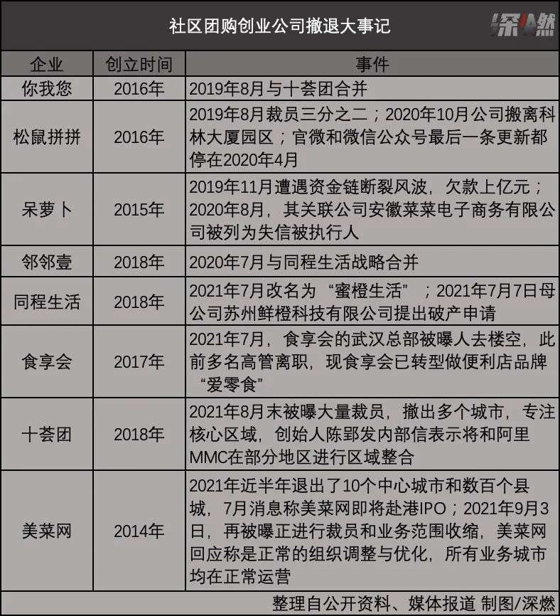 十荟团、美菜、菜划算、橙心优选都开始收缩,但尚在运营之中。反观已经申请破产的同程生活、转型便利店的食享会,还有一众沙砾,早就在社区团购混战中划掉了自己的名字。