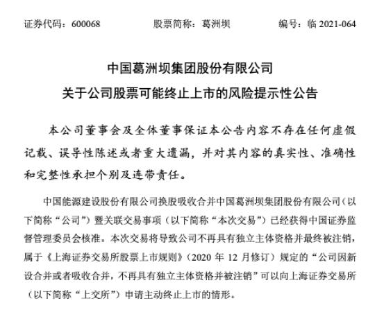 公告显示,合并完成后,葛洲坝将终止上市,中国能源建设作为存续公司,将通过接收方葛洲坝集团承继及承接葛洲坝的全部资产、负债、业务、合同、资质、人员及其他一切权利与义务,葛洲坝最终将注销法人资格。