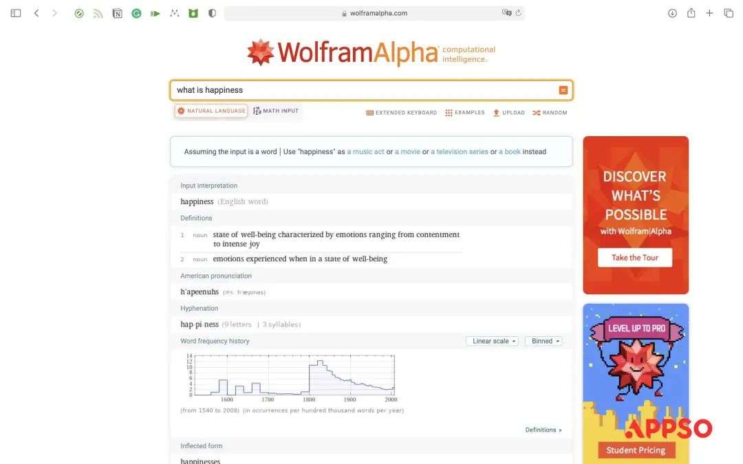 它不仅可以计算各种数学题型,还涵盖了社会和人文学科,甚至是你的日常生活。即便是拿来挖掘新事物,也比传统搜索引擎有趣得多!比如我搜了一个单词,它不仅返回了定义,还有历史搜索频次、相关词汇和主要语言的翻译,甚至相关书籍或电影,帮你更全面地了解搜索内容。