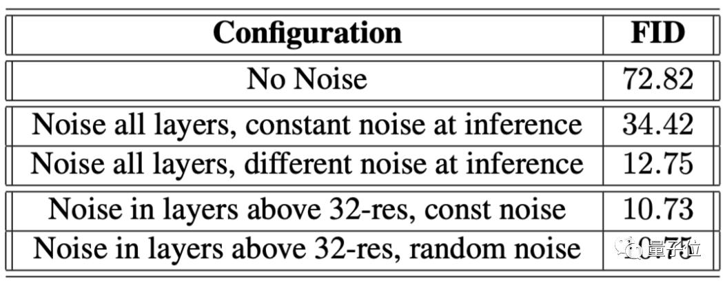 在所有层加入噪声会好一些,而只在32x32分辨率以上的层加入噪声效果会更好。