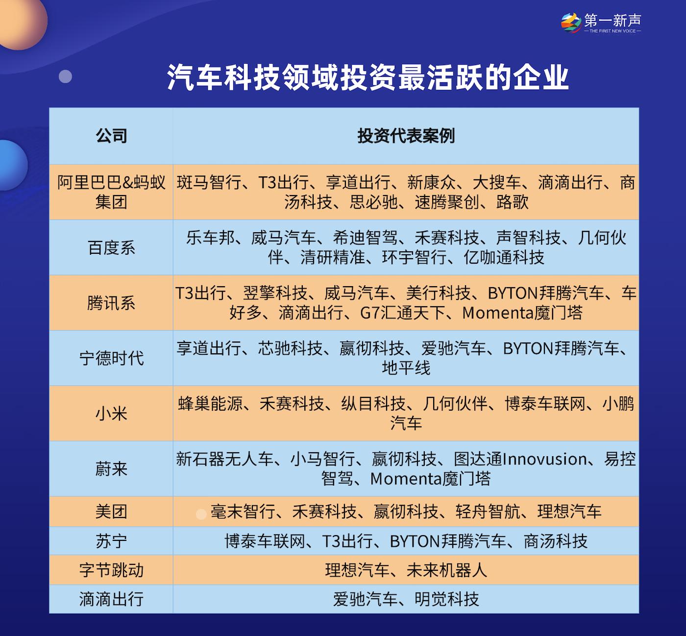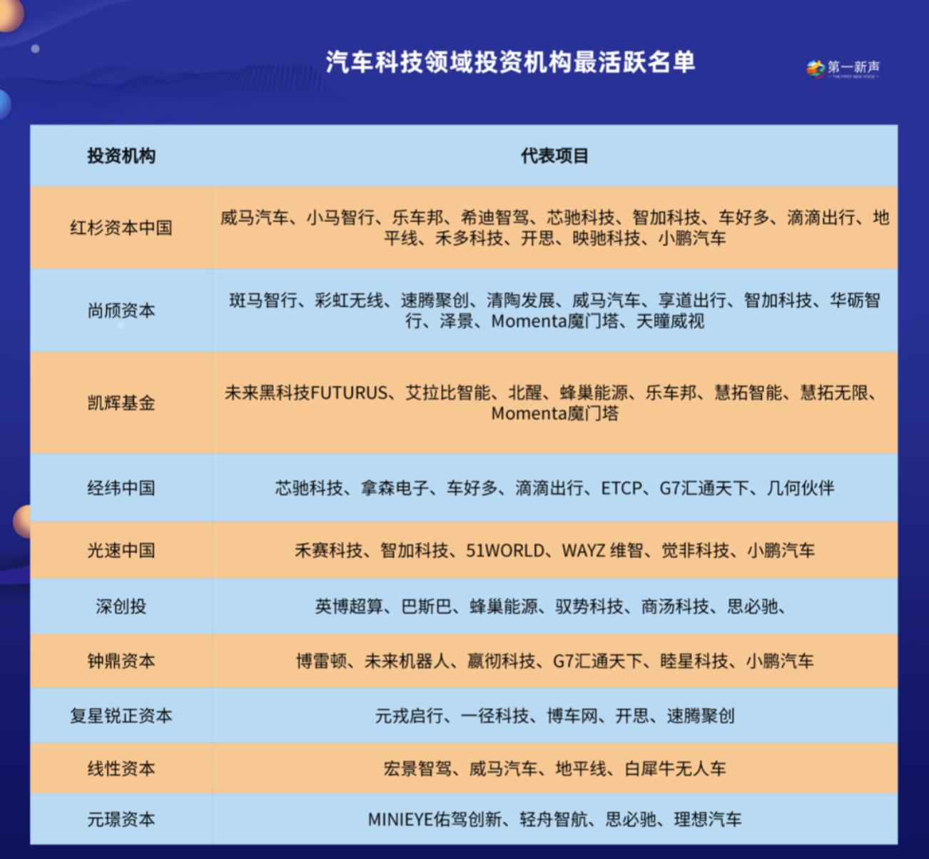 第一新声发现,在汽车科技领域活跃着一批国内知名投资机构,其中不乏红杉资本中国、尚欣资本、经纬中国、光速中国、深创投、复星锐正资本等机构的身影。