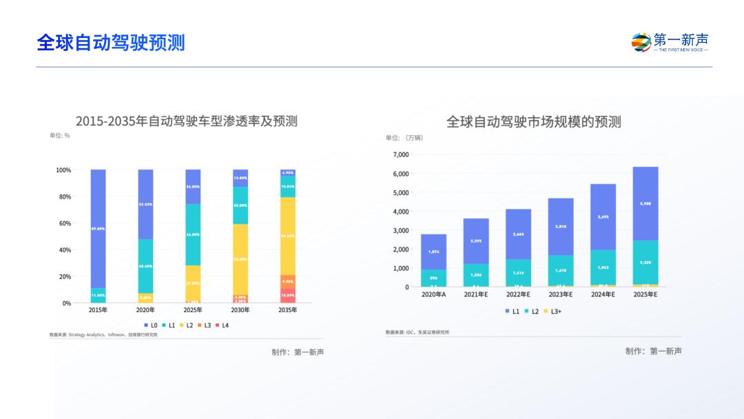根据 Strategy Analytics 预测,2020 年全球L2及以上智能汽车渗透率7%,到 2025 年达到73%,L4在2030年规模应用,L5 在2035年规模应用。高工智能产业研究院预计中国市场发展更快,到2025年L3 渗透率为20%,L4开始进入市场。