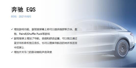 奔驰在8月对其旗舰电动轿车EQS推送了最新的OTA升级,副驾驶屏幕上不仅提供了俄罗斯方块、数独、Pairs和Shuffle Puck等游戏,还增加了导航、音频和舒适设置,可以独立通过蓝牙耳机收听独立音乐,也可以搜索导航目的地并发送至中控屏上。另外,本次OTA增加了开关车门的新动画和声音效果。