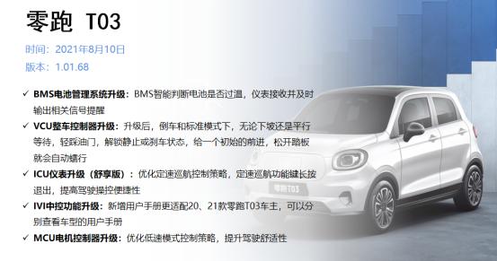8月交付量达4409台的零跑T03迎来了1.01.68版本的上线。