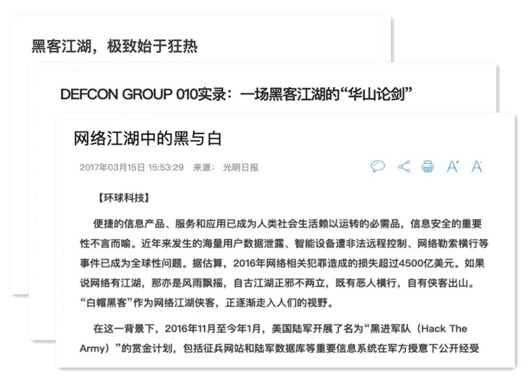 一个时代的优秀人才总是成批的涌现,再成批的褪去。中国上一代最优秀的安全人才,有的禁不住诱惑去做了黑产,有的看着安全行业没前途选择了转行,还有一部分在“3Q 大战”中被大企业收编。之前凭着热血和激情入行的“草莽之众”,逐渐大浪淘沙转变为了企业里的正规军。