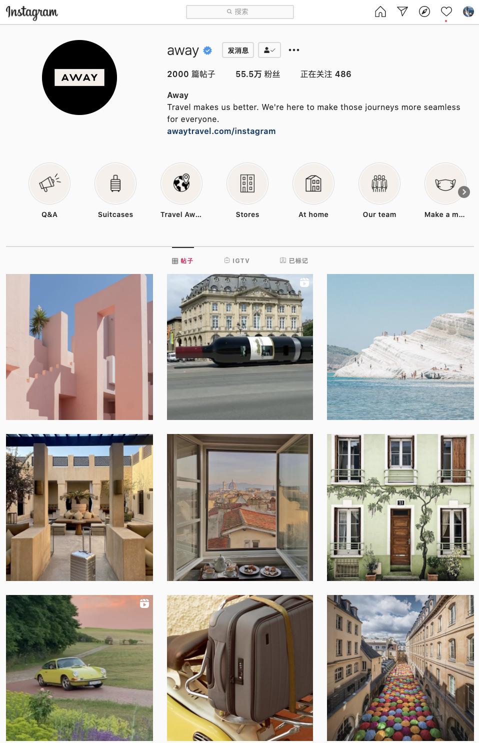美国一家专门卖旅行箱的 DTC 品牌 Away 在 Instagram 上有 55.5 万粉丝,在平台上分享旅游帖子来传递它的品牌价值。