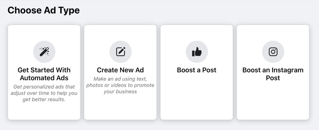 在 Facebook 上,你可以选择 4 种不同的广告类型,分别是自动化广告、普通广告、推广单一帖子,以及 Instagram 帖子。