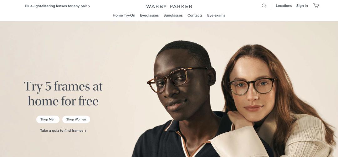 而 Warby Parker 可以让用户在官网上选择 5 副眼镜框,并「免费送上门」。用户可以在收到眼镜的 5 天内「免费试戴」直到作出选择。最后网上下订单,品牌方再次免费送上门。一副眼镜的价格可以低至 95 美金。