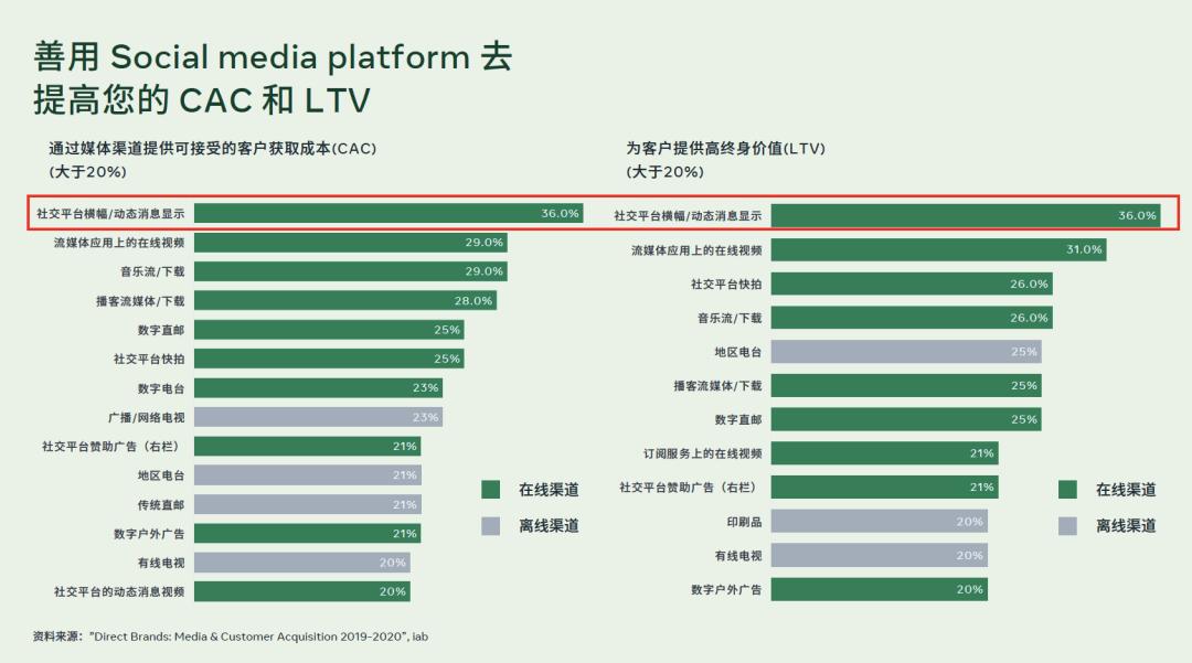 据 Facebook 发布的《 DTC 跨境电商白皮书》显示,「社交平台」成为了「获取用户」和提高 LTV (用户生命周期价值)最重要的一个工具。