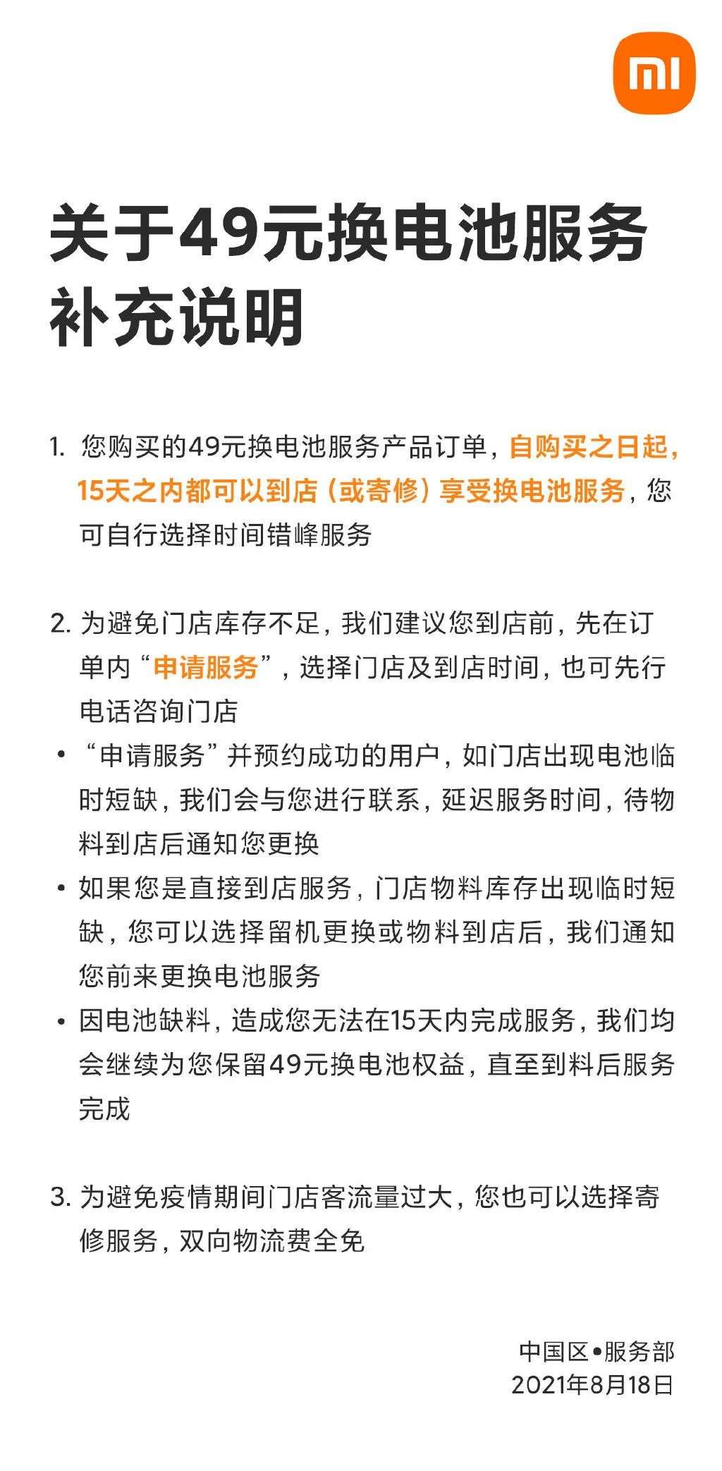 喏,今年8月15日小米就推出了「49元电池换新服务」。