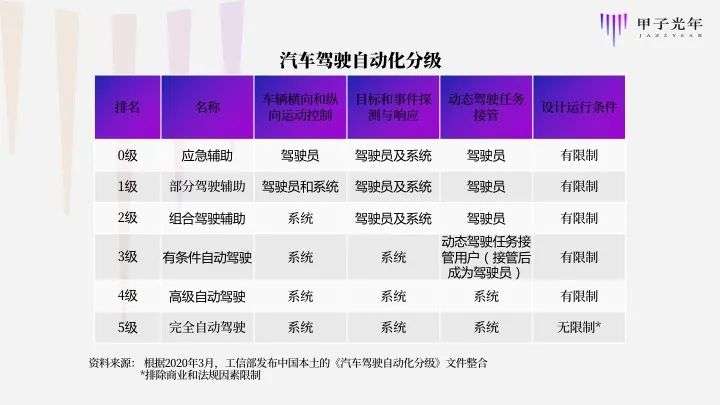 2014年SAE发布了《SAE驾驶自动化分级》,将自动驾驶分为L0~L5六个分级;2020年3月,工信部发布中国本土的《汽车驾驶自动化分级》文件,基本沿用了美国SAE的标准。