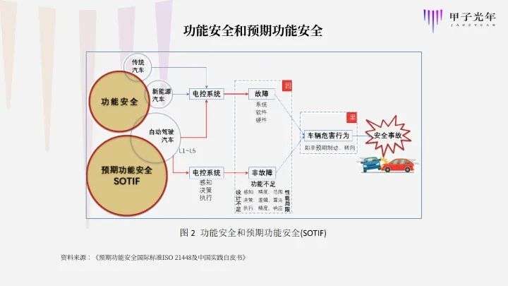 类似这样的安全风险,传统的“功能安全”已经无法满足车辆的安全保障要求,“预期功能安全(SOTIF)”的概念应运而生。
