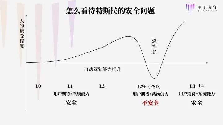 这种概念混淆会带来安全隐患,朱西产教授称之为“恐怖谷效应”。朱西产认为,如今所处的“L2+”时代,是最不让人放心的阶段。“L2+”具备了部分“L3、L4”的功能,但系统能力又达不到“L3、L4”的水平,如果用户使用过程中不能及时地消除用户误用,就有可能带来安全问题,出现用户信任危机。