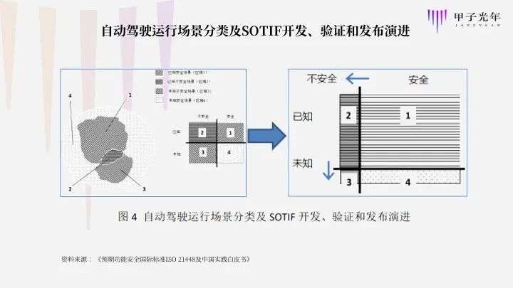 从安全性和已知性角度,预期功能安全将车辆运行场景分为“已知安全场景、已知不安全场景、未知不安全场景和未知安全场景”4个区域。预期功能安全的工作,就是将已知不安全场景和未知不安全场景转化为安全场景。