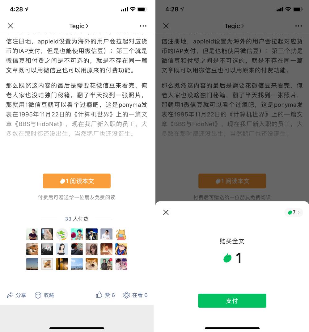 热度是什么,应该怎么结算,这些已然需要该功能扩大放量规模后才能了解。我们先从具体文章的付费体验上对微信豆的支付流程做了一番对比。