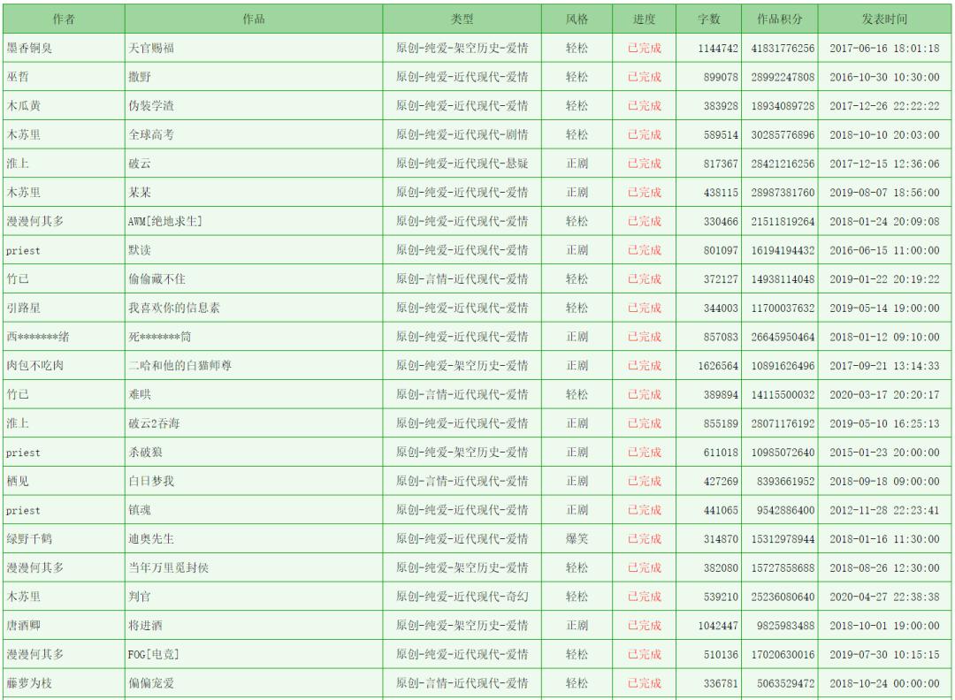 在女性向原创文学网站晋江文学网中,耽美作者及其作品有着广泛的受众和巨大的影响力。站内获得百亿积分的作品中,绝大多数为双男主作品,除了大众耳熟能详的《天官赐福》、《撒野》、《镇魂》等,《伪装学渣》、《全球高考》等文在晋江上也有极高的人气。
