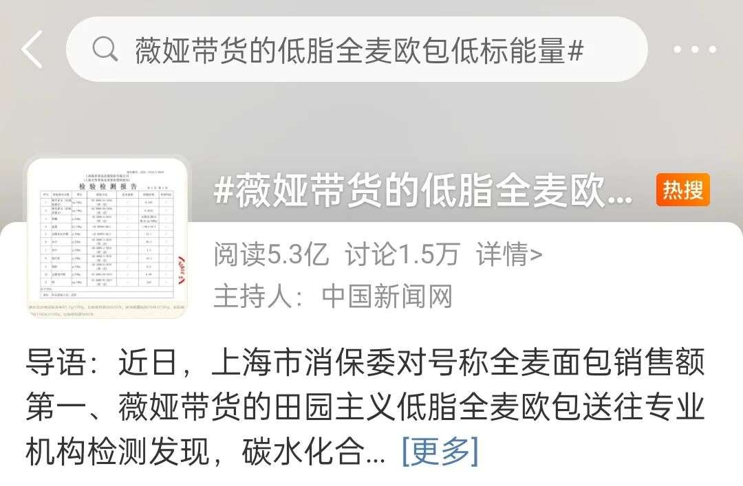 8月30日,上海市消保委对号称全麦面包销售额第一、薇娅带货的田园主义低脂全麦欧包送往专业机构检测发现,碳水化合物比标称多出约36%,所含能量比宣传的多出40%。之后,薇娅背后的MCN机构谦寻与该品牌停止合作。