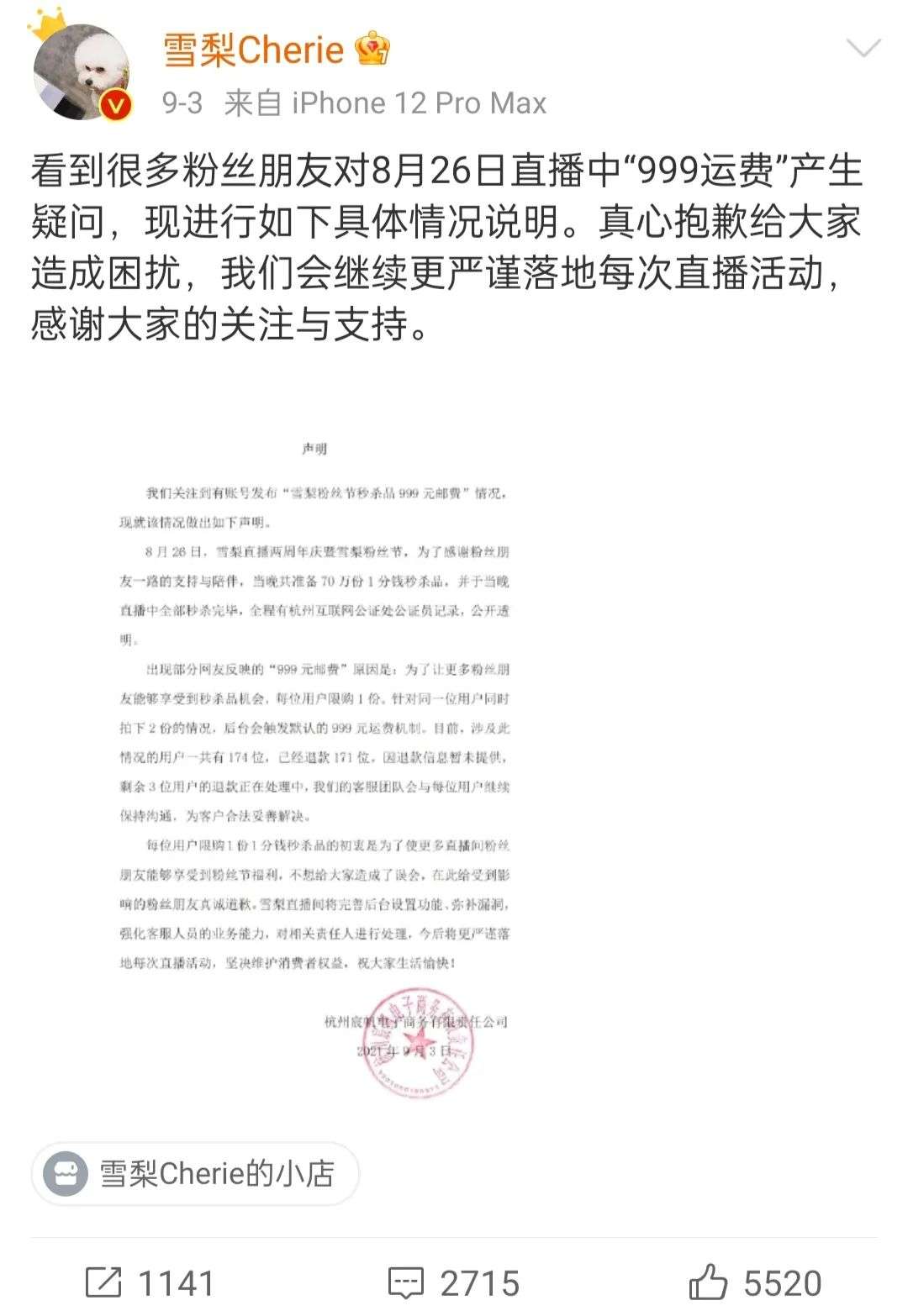 9月2日,据极目新闻报道,一位消费者在雪梨直播间秒杀商品,2分钱买到一个枕头加一支电动牙刷,结算时运费要999元。一天后,雪梨发布道歉信。