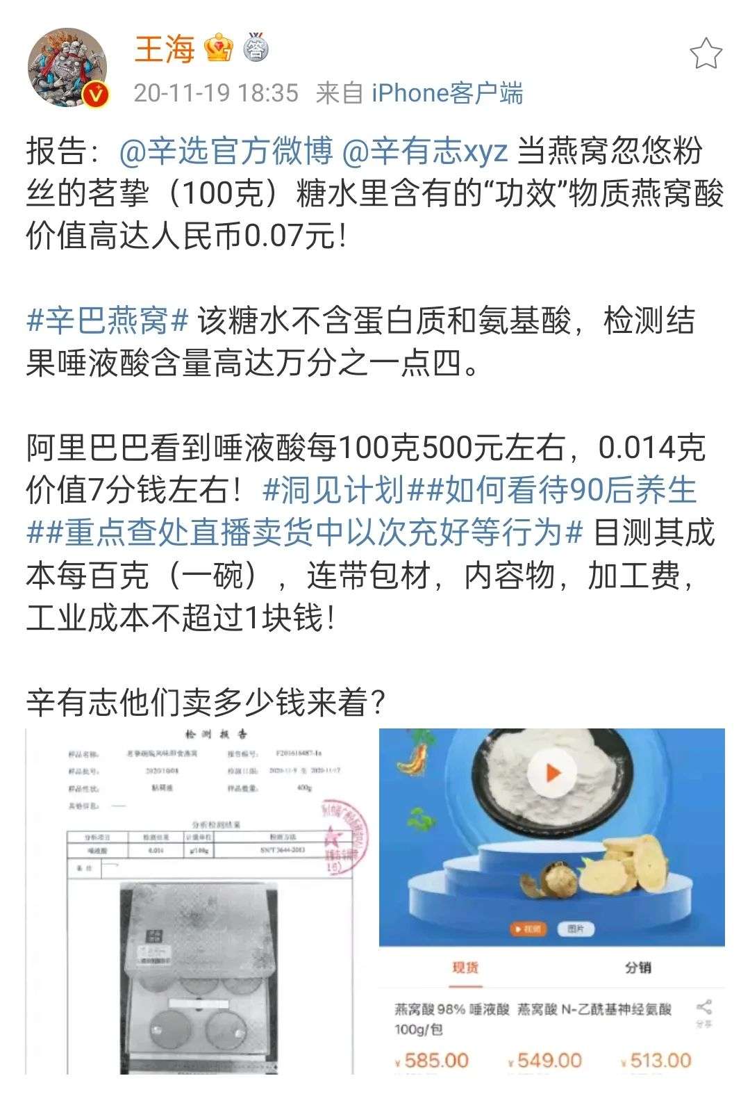 2020年11月19日,微博用户@王海 发布由中广测出具的检测报告,直指辛巴所售的即食燕窝产品“就是糖水”,引发社交媒体大面积讨论。