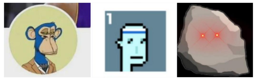 这只蓝色的猴子,是球星库里最近新换的Twitter头像,为了购买这个数字头像,他花了55个以太坊,大约等于18万美金;这个长着红色激光眼的石头,是波场TRON创始人孙宇晨的收藏品,在9月3日被以799.99ETH,也就是约合30720美元的起拍价拍卖。