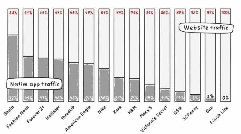 虽然以上这些玩法在国内电商平台看来已经十分“俗套”,但在海外用户的眼中却仍然是相当新奇有趣的存在,这使得SHEIN的APP直接在这一刚刚起步的市场中拔得头筹,直接掌握了全网Top10 的快时尚品牌 APP 端将近一半的DAU。