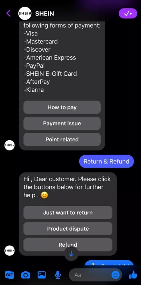 而SHEIN的Facebook私信回复功能几乎是当时国内同期的出海品牌中做得最好的。比照淘宝的自动客服,SHEIN设置的应答选项涵盖了物流、付款、退款、产品信息、尺寸、新品推荐等所有客户消费环节可能碰到的问题;在结束对话之前客服还会向用户发送“互动体验”评分邀请,指导用户给品牌提出建议。