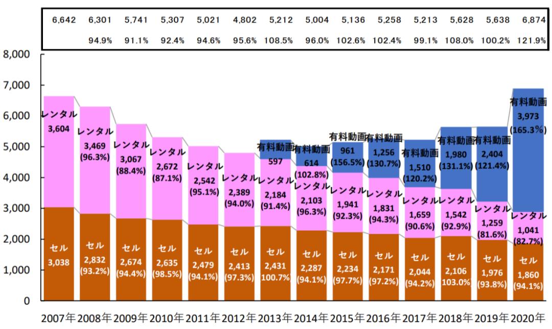 据日本映像协会统计,2020年付费视频市场规模已超过光盘个人用和租借店用销售额的总和。