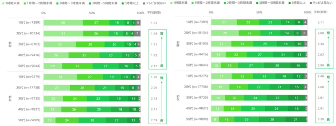 另外根据Line的调查,目前日本几乎人人拥有电视。而在有电视的人中,使用电视观看节目的比例也很高。下面左图为工作日看电视情况,右图为休息日看电视情况。绿色越深代表收看时间越长,灰色表示完全不看。