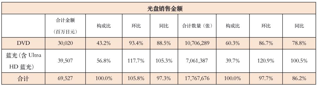 其中,DVD销售金额为300.3亿日元,同比下降11.5%,而蓝光销售金额为395.07亿日元,一举超过DVD,同比增长5.3%。销售数量方面,DVD同比下降21.2%,蓝光同比增长0.5%。