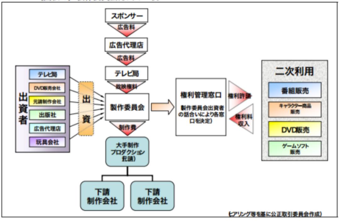 但光盘仍是日本动画行业重要的商业模式之一。如果是通过制作委员会的方式制作动画,整体模式大概如下图,资金回笼有四种方法:(1)销售动画番剧;(2)销售角色商品;(3)销售DVD;(4)销售游戏软件。其中,销售DVD是资金回笼环节相当重要的组成部分。