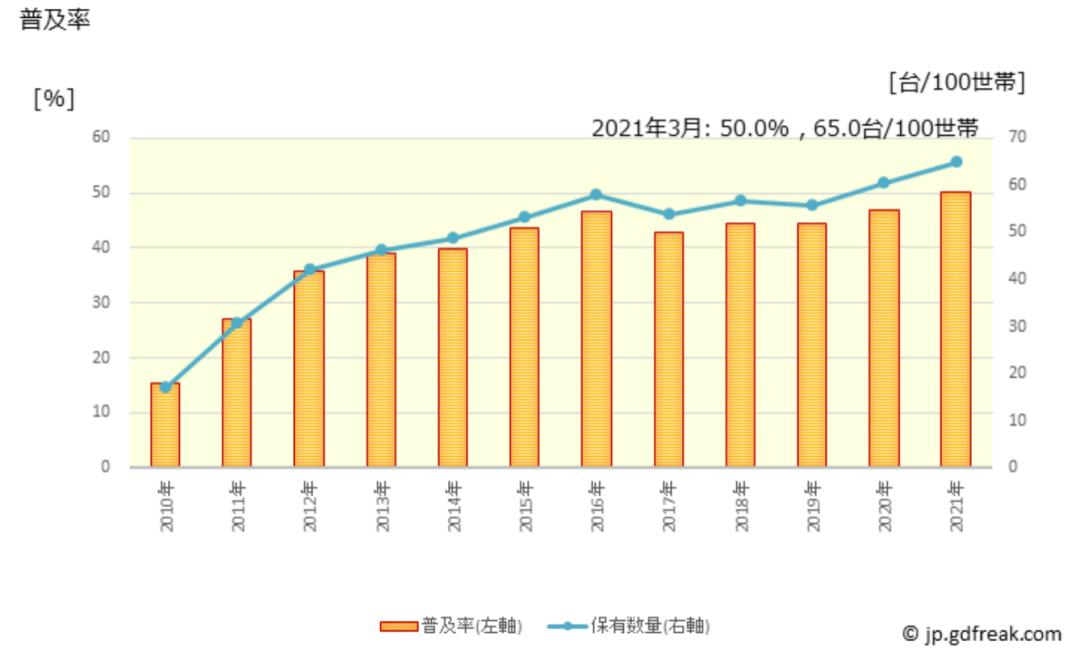此外,日本的DVD机和蓝光机普及率同样很高。DVD·蓝光录画机拥有率为58.4%,其中联网使用的有4.7%,DVD和蓝光的高普及率意味着相应商品生产出来就总是有一定的消费空间。