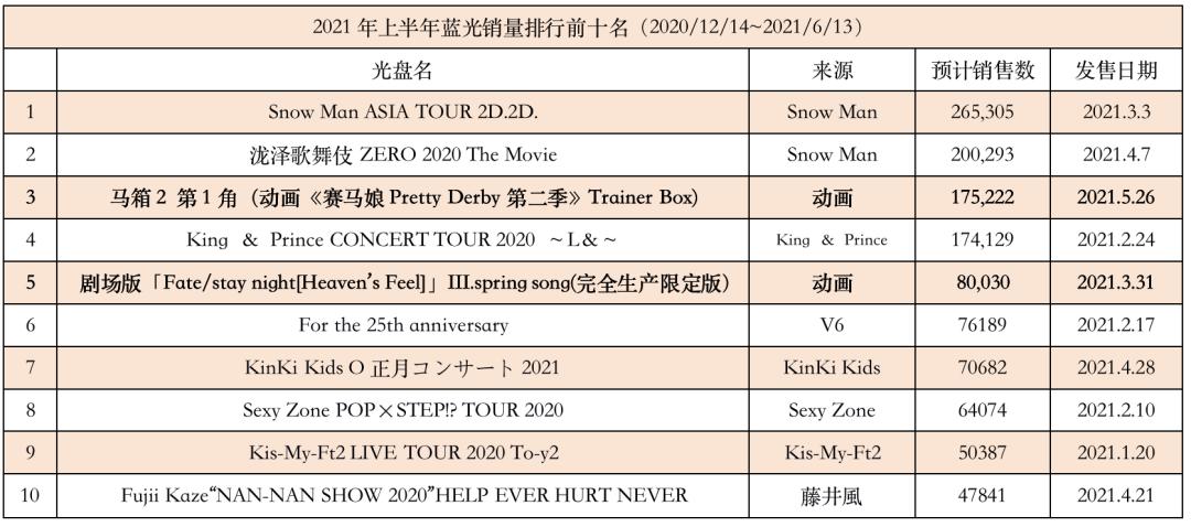 根据O榜数据,2021年上半年DVD销量前十名没有动画光盘,但蓝光销量前十中有两部动画,分别是《赛马娘》和《Fate》。