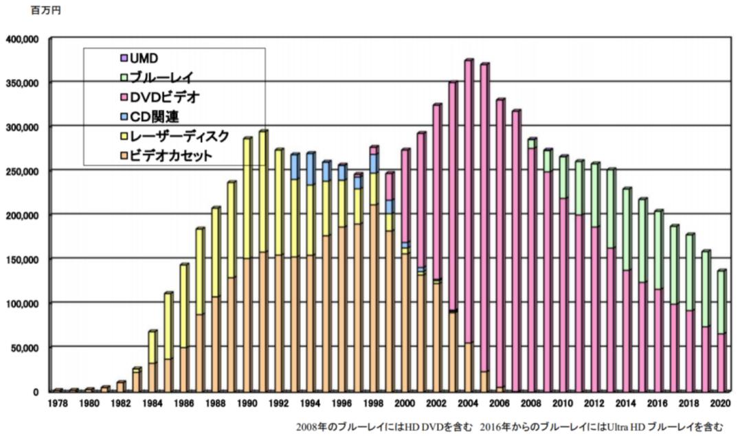 下图为日本光盘市场规模演变。虽然占市场主流的品类从激光盘和录影带变成了DVD和蓝光,技术的进步迭代十分明显,但自2004年的最高峰过后,日本光盘市场还是头也不回地走上了下坡路。