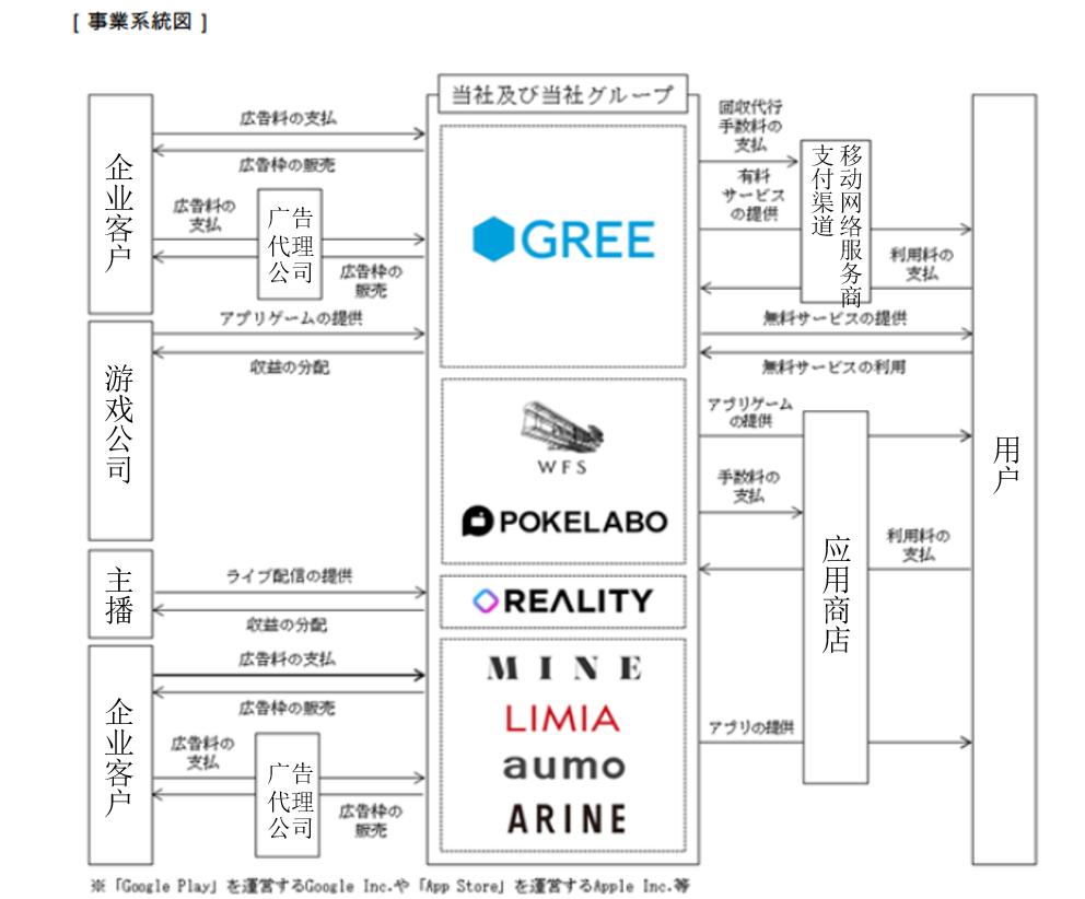 GREE的社交游戏业务开始于2004年,广告媒体业务开始于2011年,两者皆以社交网络GREE为平台,前者营收来自付费服务和游戏内氪金内容,是最主要的业务;后者主要提供面向企业的广告服务。