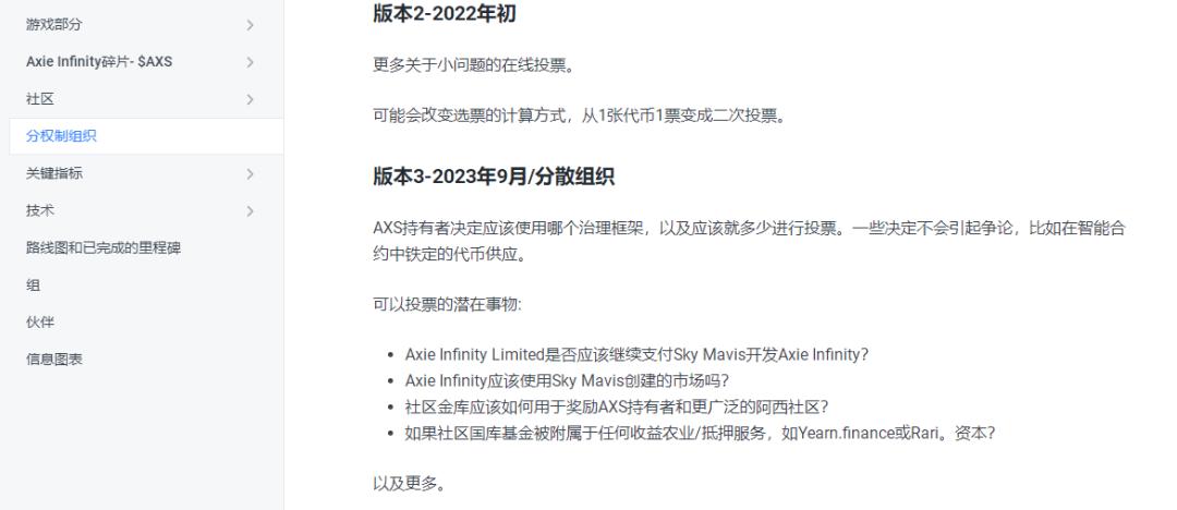 而按照游戏开发团队Sky Mavis在白皮书中预想的计划,到了2023年,开发团队将会失去对《Axie Infinity》的绝对投票权。届时,游戏将会由持有AXS代币的玩家掌控主导,完成去中心化。