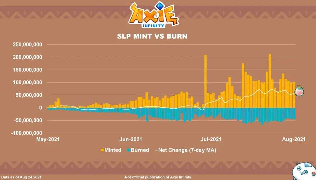 这样的调整,意味着SLP的消耗(Burn)将大幅增加,消耗掉过剩的货币数量。反之,如果未来新玩家增长的速度放缓,Sky Mavis同样可以再次进行调整,将产出(Mint)的份额重新提高,从而将货币的供需关系维持在一个更平衡的状态。