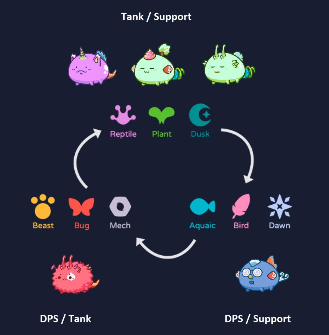另一个决定Axie质量的点,就在于它的种族特性上。每只精灵都有自己的种族,身体由犄角、尾巴等六个随机部位组成。它们之间的组合,决定了Axie自带的四张战斗卡牌的属性与攻击方式。不同的种族属性拥有一套相对应的克制关系,能够产生15%的伤害增益或减免。