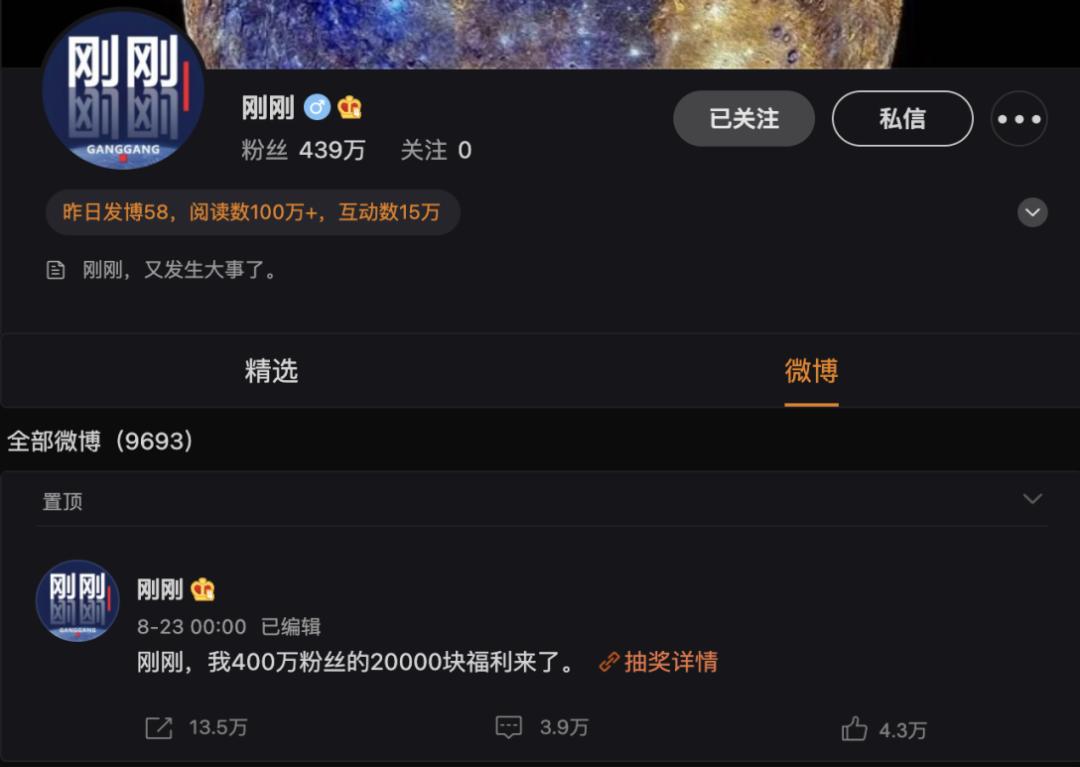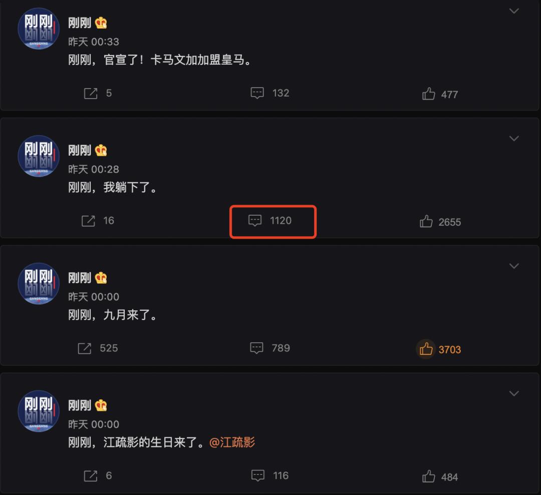 刚子原本也是做自媒体的,学新闻出身。“刚刚”账号最开始做,他会在大V微博下面评论,获得了不少热评。有一段时间,被好几个明星回复了,并且有了深入的互动。在前不久的奥运会期间,刚刚的流量获得了爆发式增长,一天有几十万的互动,1亿的阅读。
